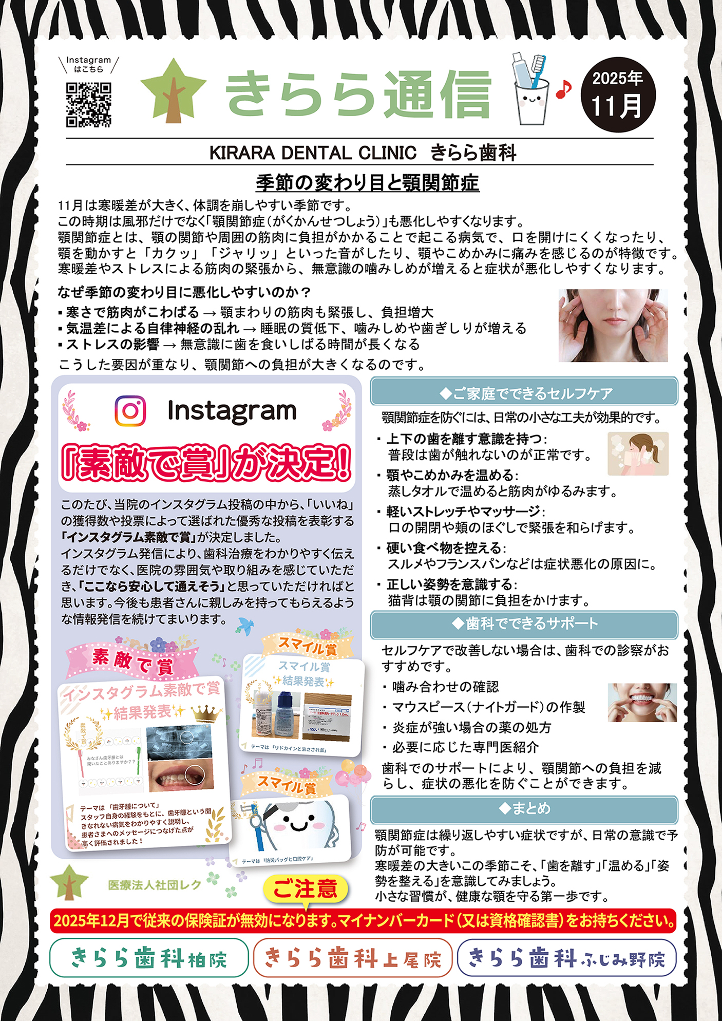 きらら通信 きらら通信11月号です 2025年11月04日 こんにちは! 医療法人レクきらら歯科です!医療法人レクでは毎月「きらら通信」 を発行しています✨11月は『季節の変わり目と顎関節症』についてです。詳しく知りたい方はお気軽にスタッフにお声かけください!