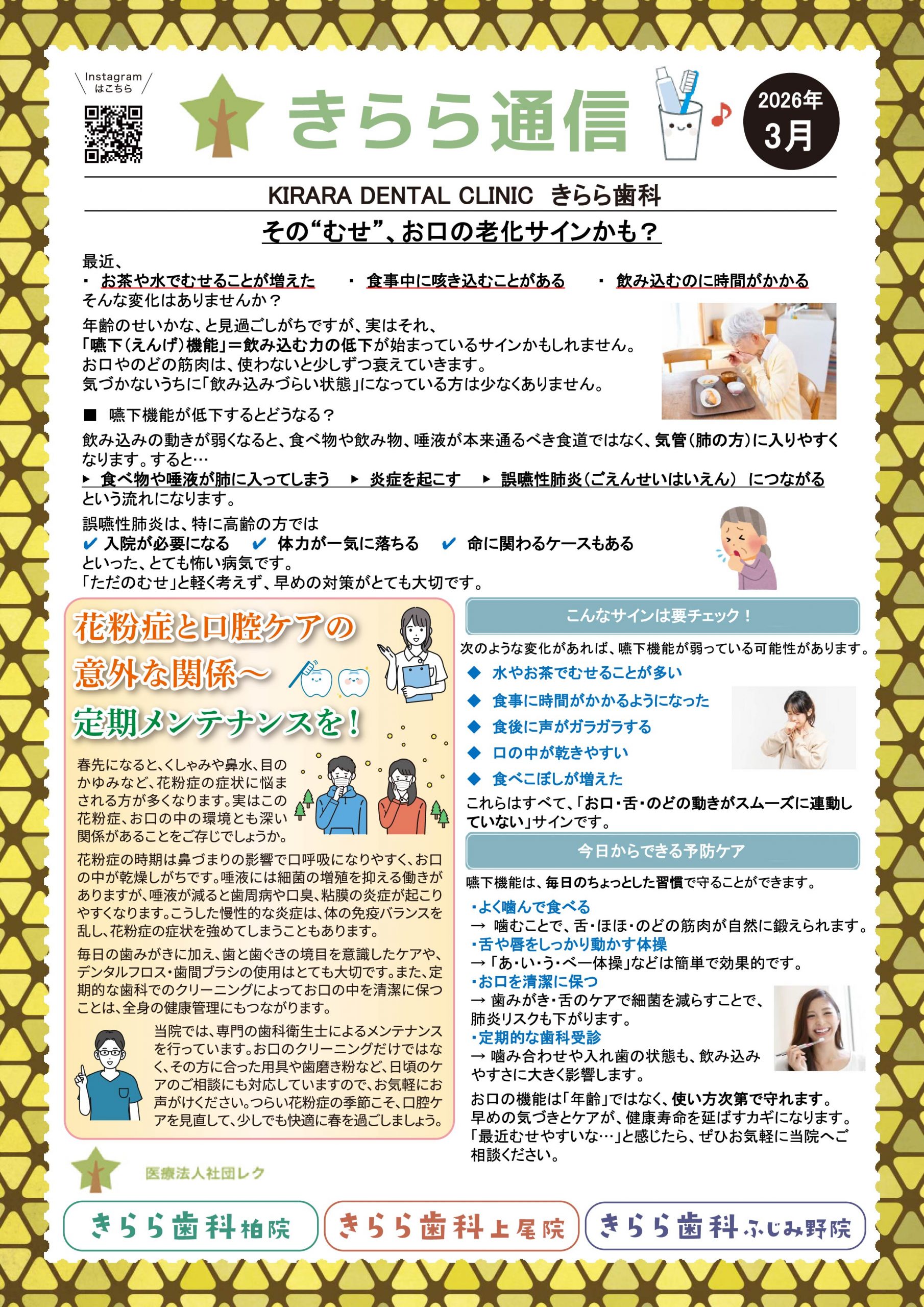 きらら通信 きらら通信3月号です 2026年02月27日 こんにちは! 医療法人レクきらら歯科です!医療法人レクでは毎月「きらら通信」 を発行しています✨3月は『お口の老化サイン』についてです。詳しく知りたい方はお気軽にスタッフにお声かけください!